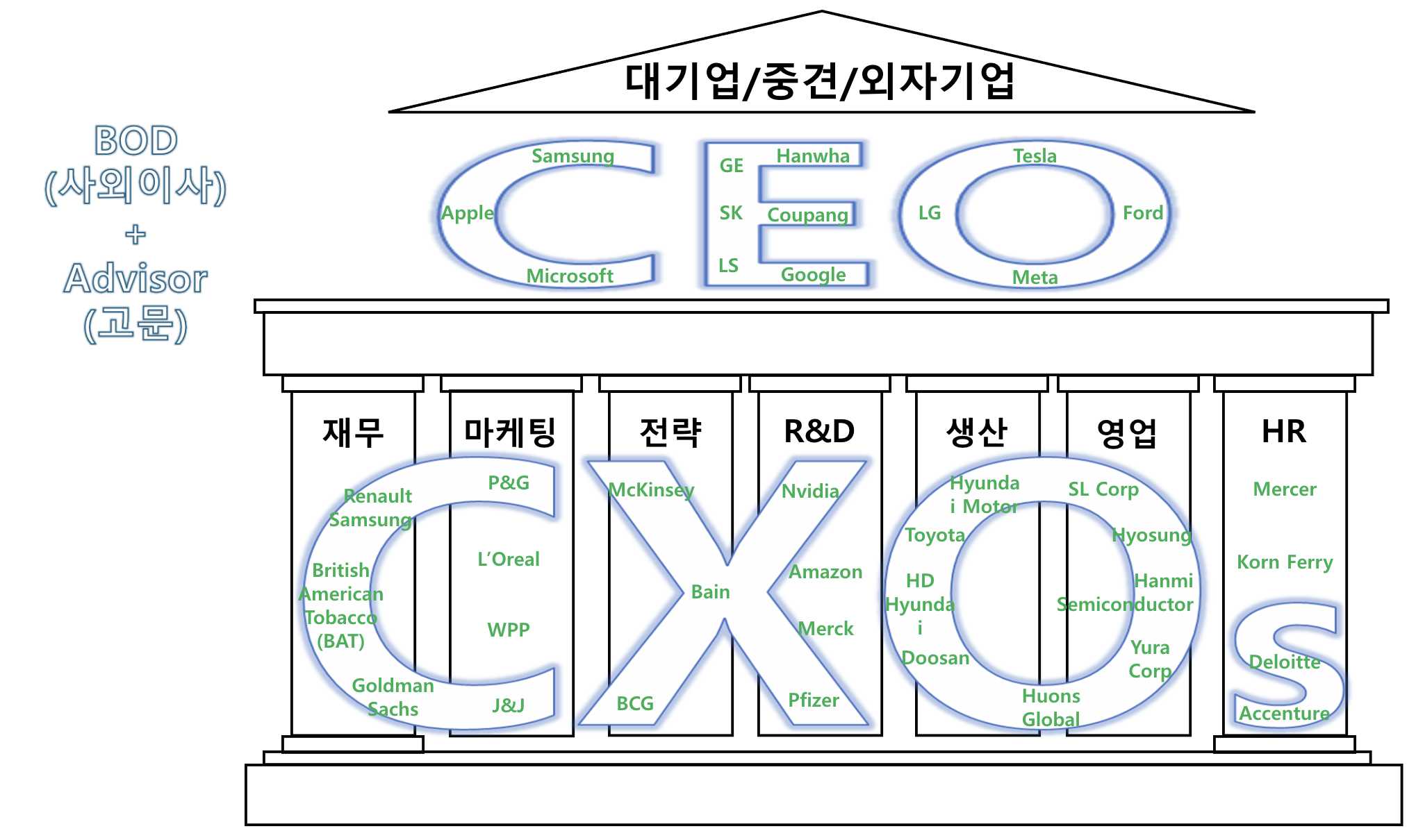 글로벌 외자기업은 대기업 본사 경험을 갖고 있는 인재가 필요할 수 있고, 국내 중견기업은 글로벌 기업과 대기업 출신 임원이 필요할 수 있으며 대기업은 해외 경험이 풍부한 글로벌 외자기업 출신 임원이 필요할 수 있습니다.